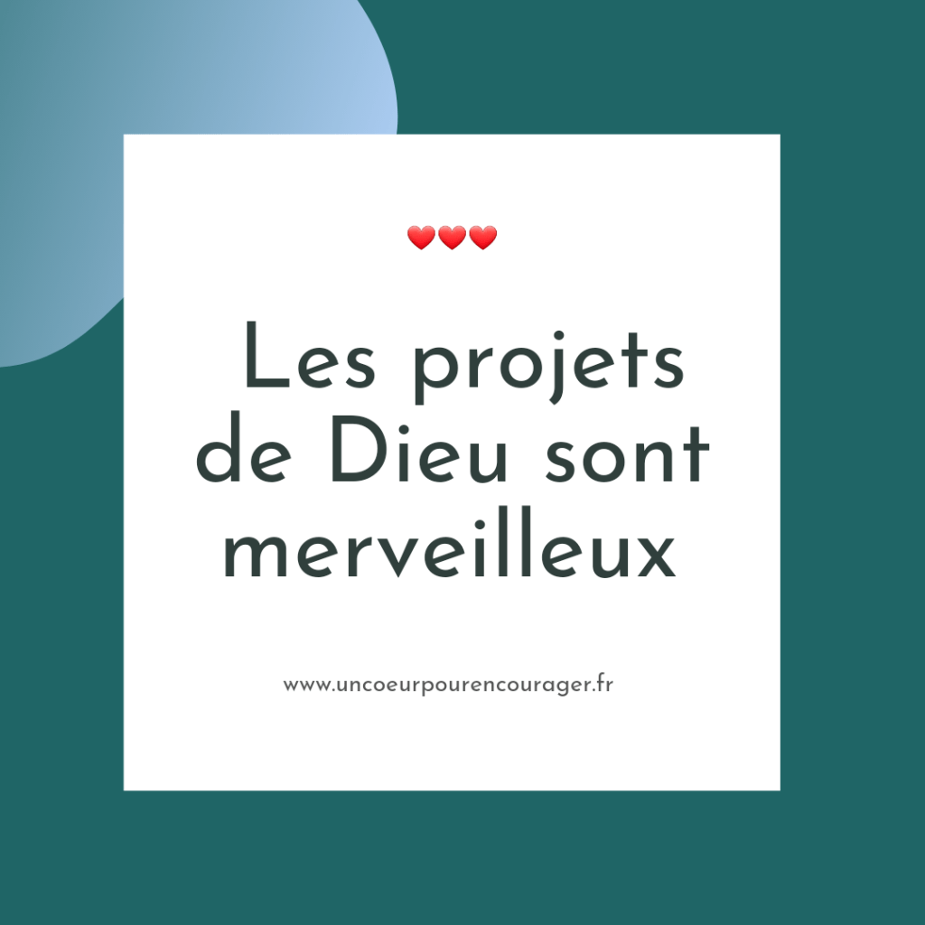 Les projets de Dieu sont grands, dépassent mon entendement. Il me donne les capacités, le vouloir et le faire. Je suis toujours émerveillée de ce qu’il me permet d’accomplir, des projets que je n’aurai jamais osés réaliser.